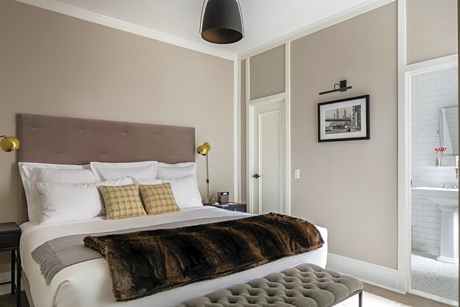 This room features a queen bed, desk, armoire, bay windows, crown molding and hardwood floors accented by custom Turkish Patchwork rugs. A curated mini-bar and pre-war style bathroom, offering CO Bigelow® products, are also included.