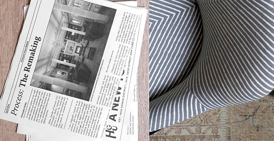 This room features a queen bed, desk, armoire, crown molding and hardwood floors accented by custom Turkish Patchwork rugs. A curated mini-bar and pre-war style bathroom, offering CO Bigelow® products, are also included.