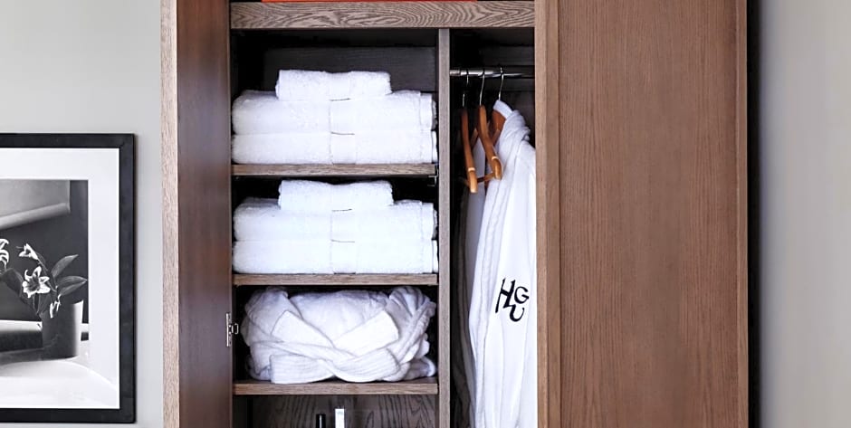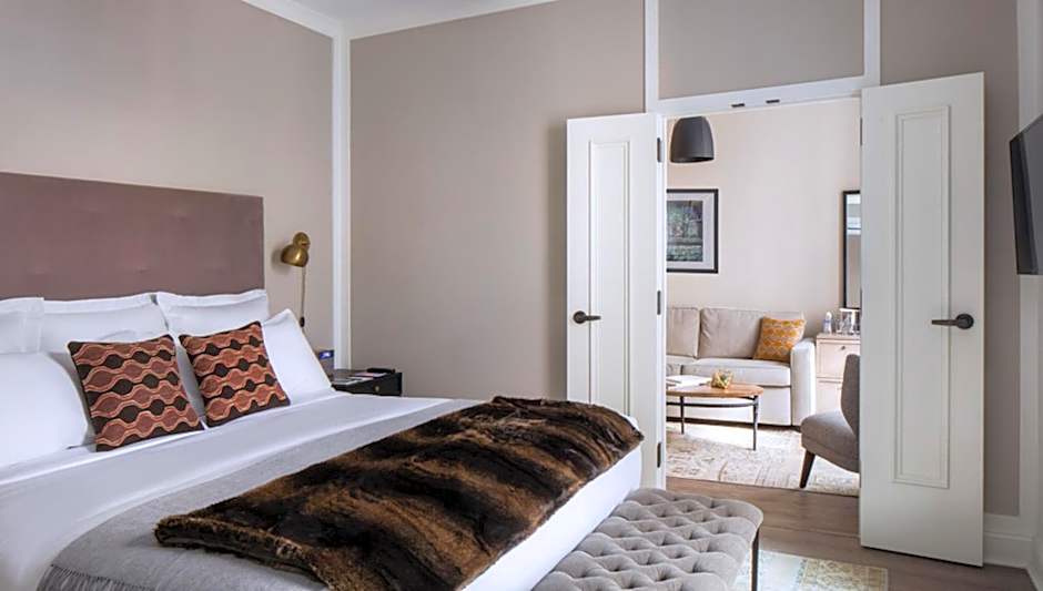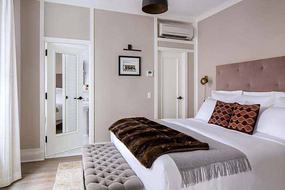 This room features a king bed, desk, armoire, crown molding and hardwood floors accented by custom Turkish Patchwork rugs. Original artwork, a curated mini-bar and pre-war style bathroom, offering CO Bigelow® products, are also included.